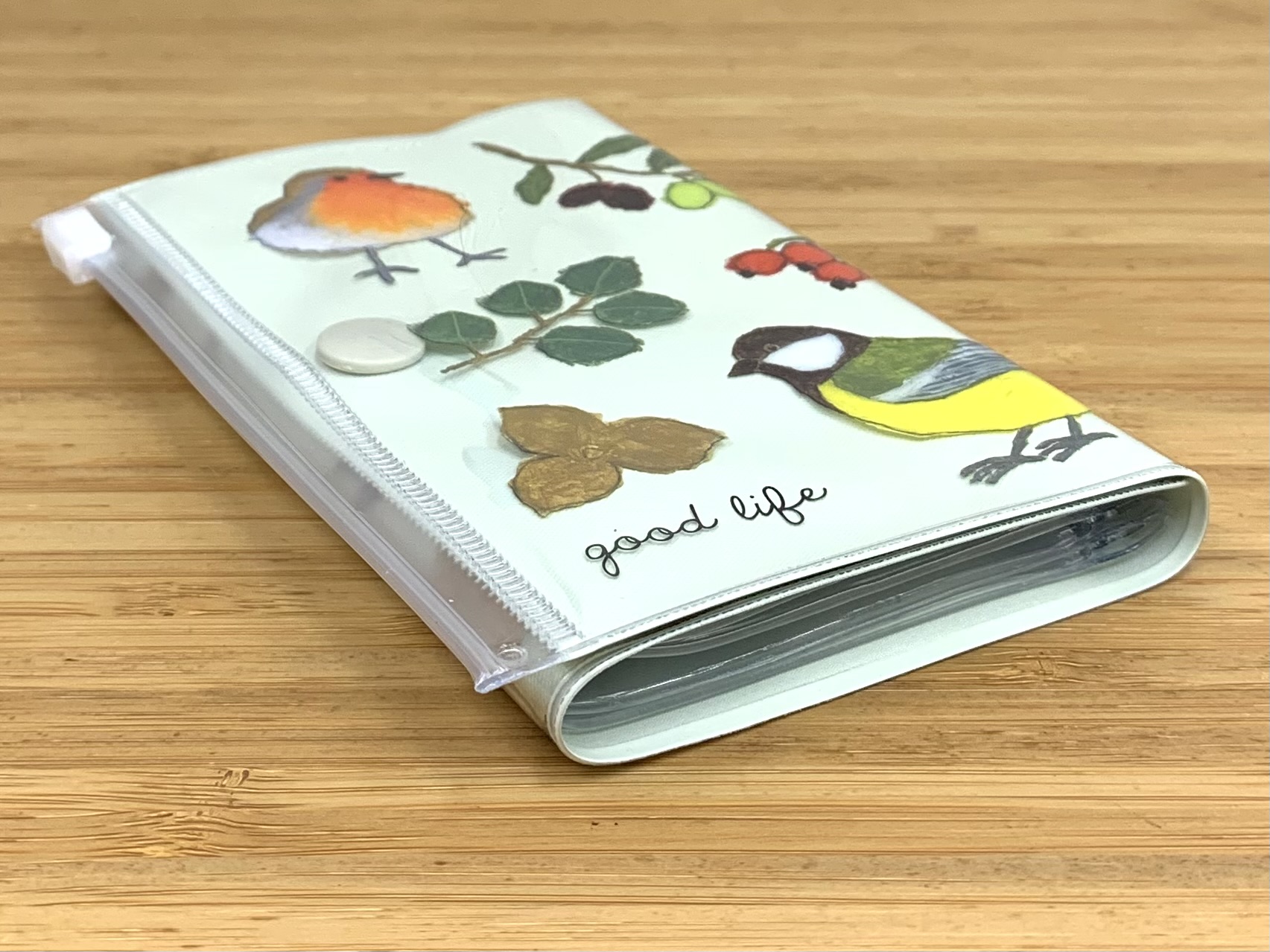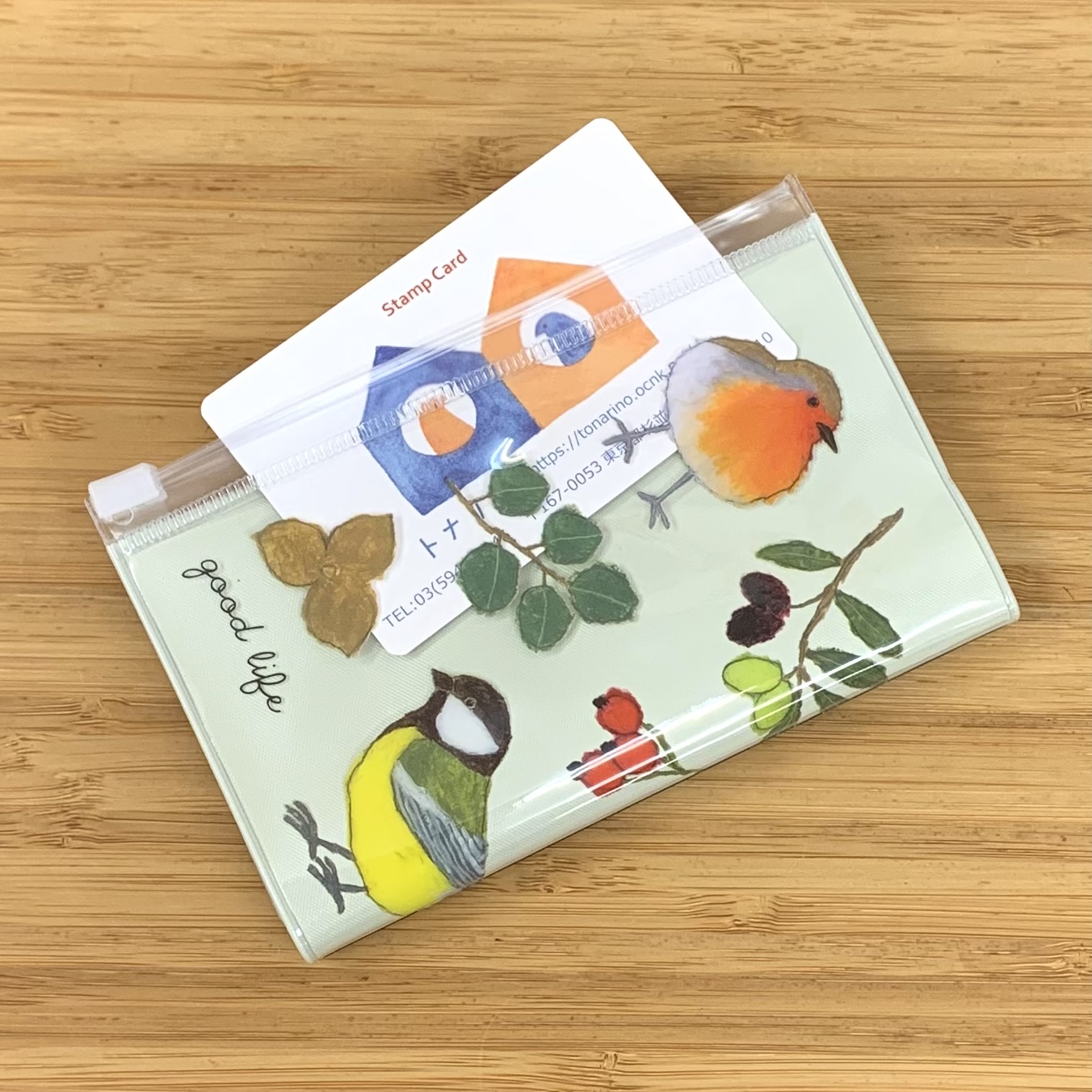 イラストレーター米津祐介さんの小鳥や植物の絵柄がかわいい三つ折りのビニールポーチ。