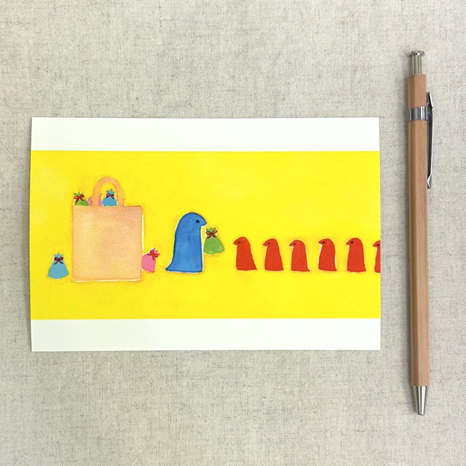 お土産をもらおうといそいそみんなで並んでいる様子がユニークな絵柄です。